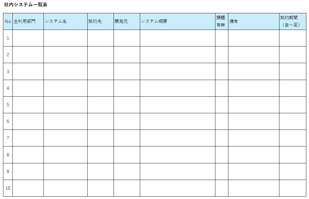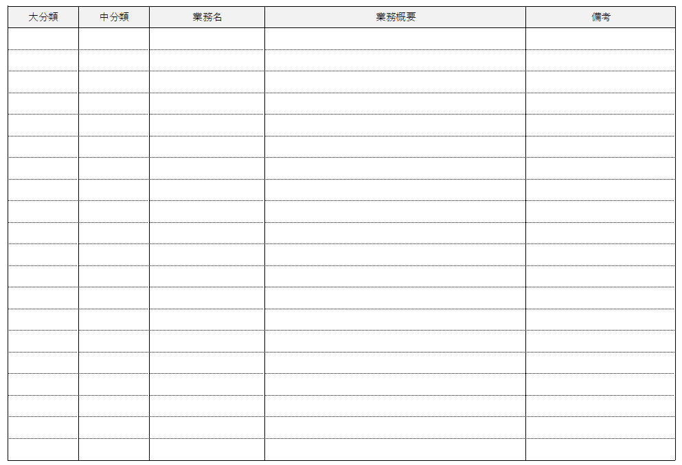 先述のように、業務一覧を作るのはマンダラートをお勧めしていますが、まずは部署単位でデジタル化を始める場合は、細かい業務一覧から始めた方が話が早いです。マンダラートからもう一段階業務レベルをくだいた、業務を棚卸する際に使う表です。