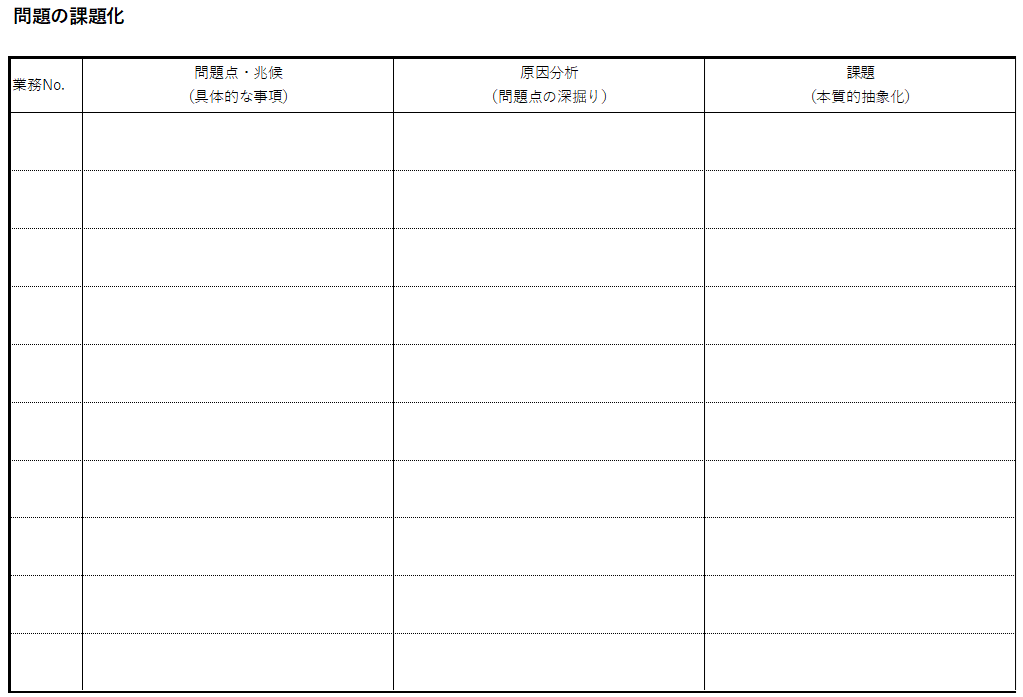 問題点の洗い出しが終わったら、先ほどのフォーマットの「問題点・兆候」欄に記入していってください。(左側の業務No.には、マンダラートで割り振ってある番号を記入します)