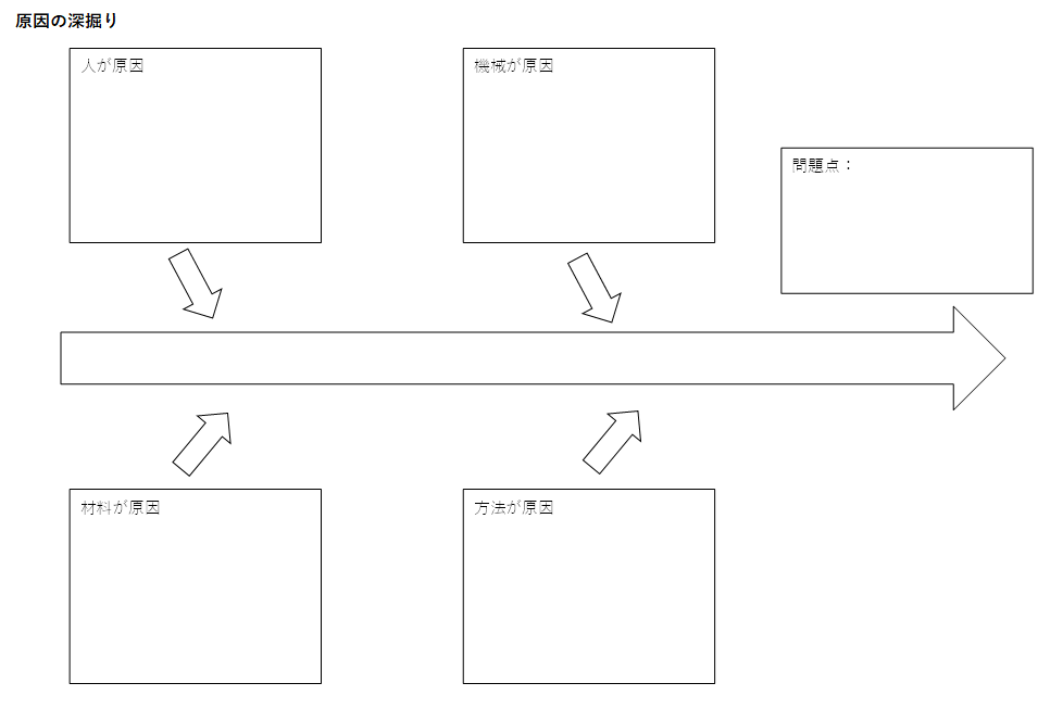 問題の原因を「人」「機械」「材料」「方法」に分けて深掘りしていくフレームワークです。(Man/Machine/Material/Methodの頭文字をとって、4M分析とも言います)