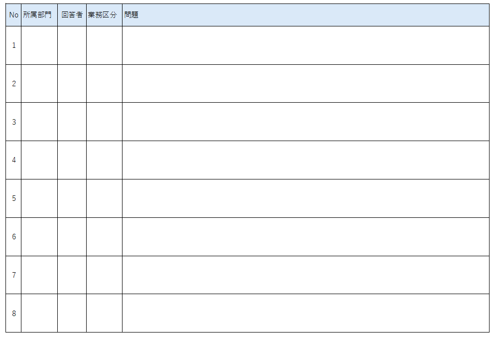 問題点の洗い出しは、先述のようにプロジェクトメンバーが集まって、ポストイットに書いてもらう方式を勧めていますが、時間や場所の問題で、アンケートで収集する場合もあります。