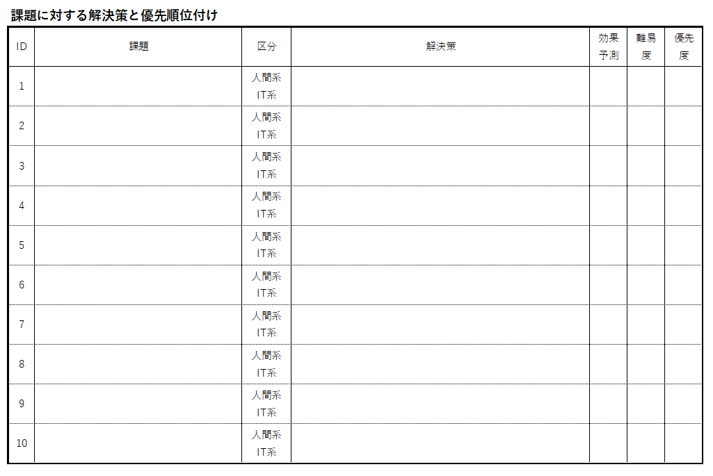 解決策には、人間系(運用ルールを定める、作業を標準化する、手順書を作る等)と、IT系(システム化、デジタル化で解決)に分けられます。