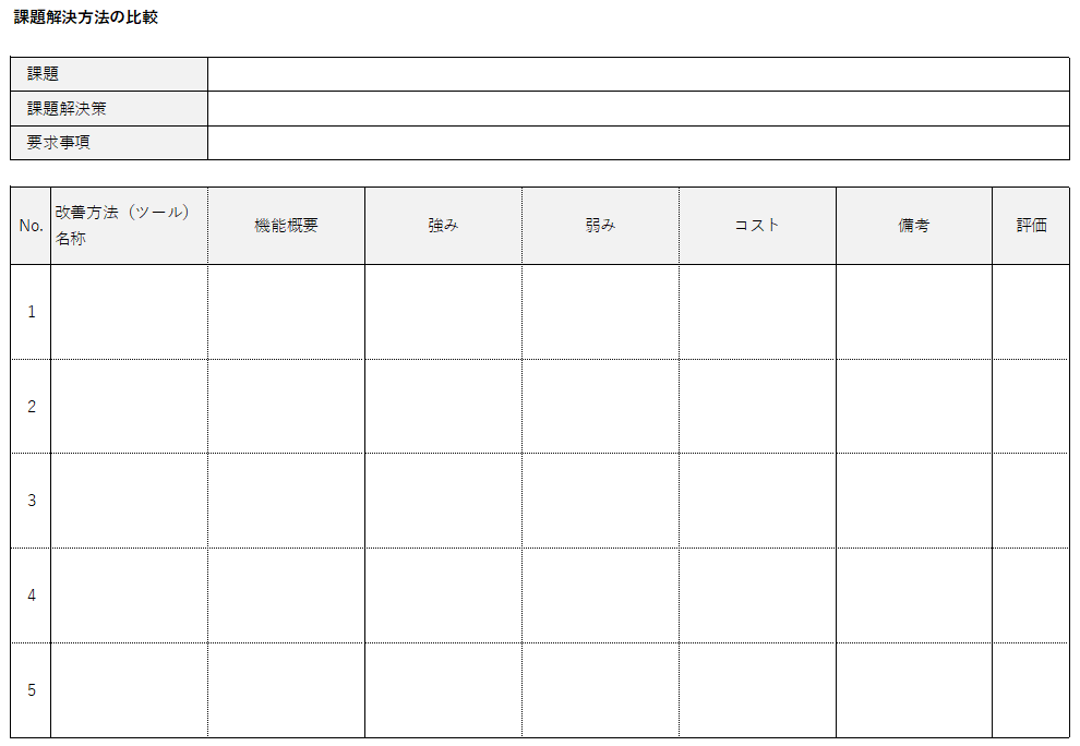 それぞれの解決策にメリット、デメリットがありますので、どの解決方法が一番課題を解決できそうか、現実的か、を勘案して、実際に導入する課題解決方法を決めていきます。