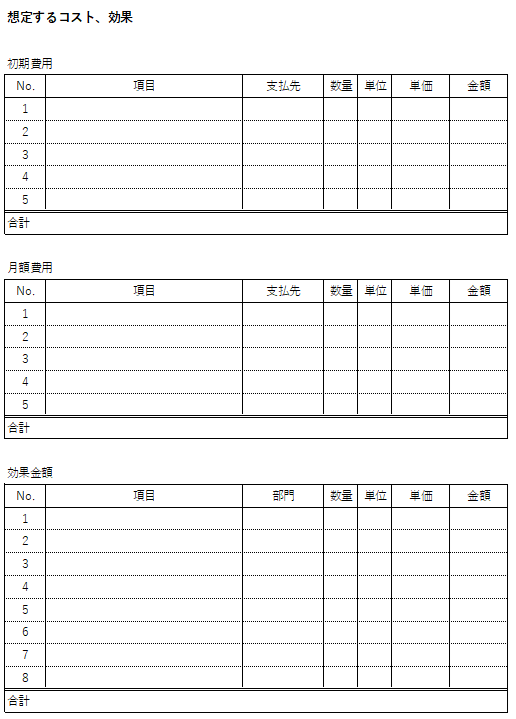 今回のプロジェクトで要する費用と、効果予測をまとめておくシートです。