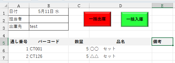 デパートの催事等で持ち出し、持ち帰りが発生するということで、持ちだしたら持ち出したことが分かるように、戻ってきたら戻ってきたことが分かるように、在庫一覧を作成しました。