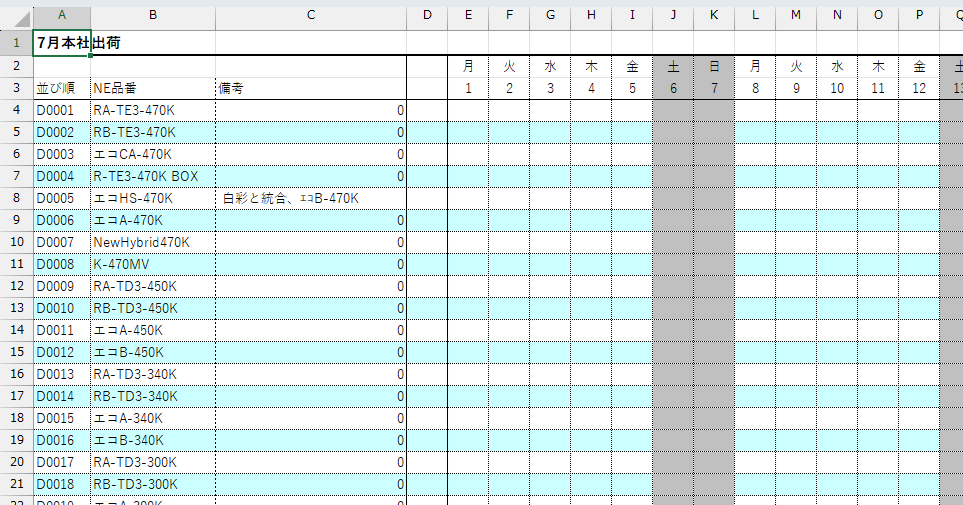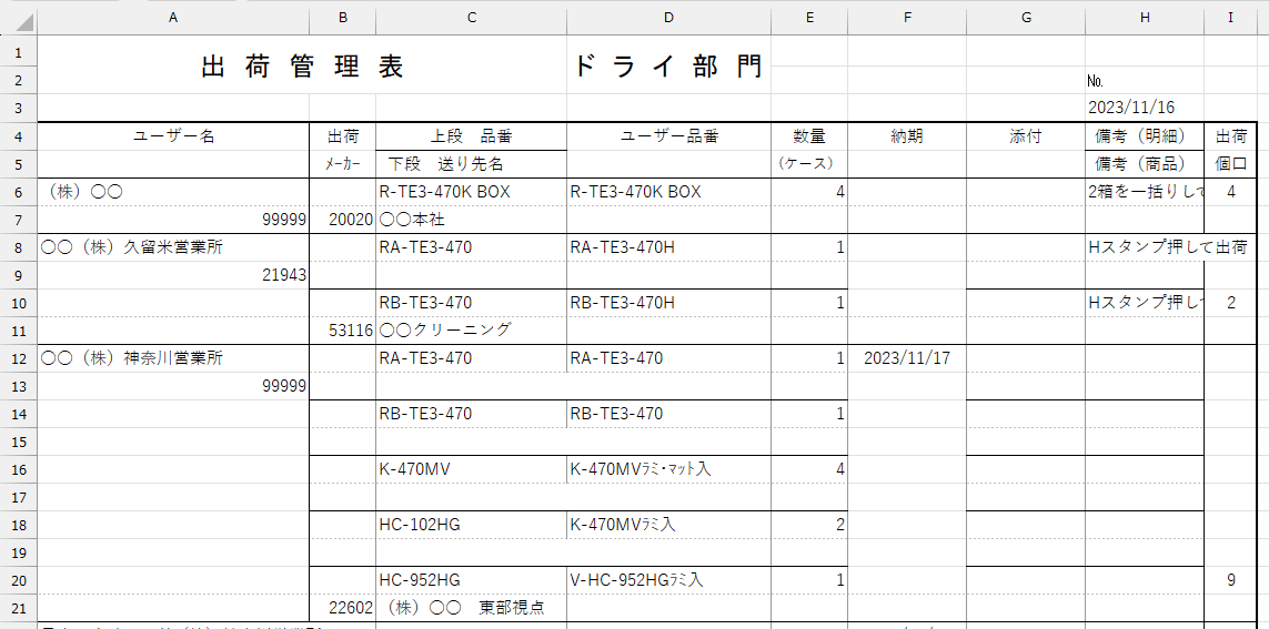 クリーニング機用のフィルターを製造・販売されている会社の出荷管理表を作成しました。