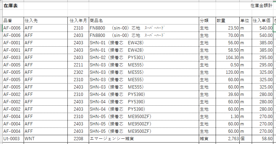 生地は、ロール(巻)で入庫してくるため、同じ商品でもロール毎に管理する必要がある、ということで、通常の在庫管理とは違った形式になりました。