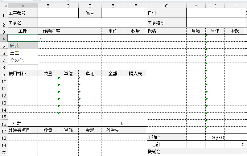 現場ごとの日誌を、使用材料、作業員数、使用機械ごとに入力していくことで、日別の費用及び工事別の費用が算出されるようにしました。