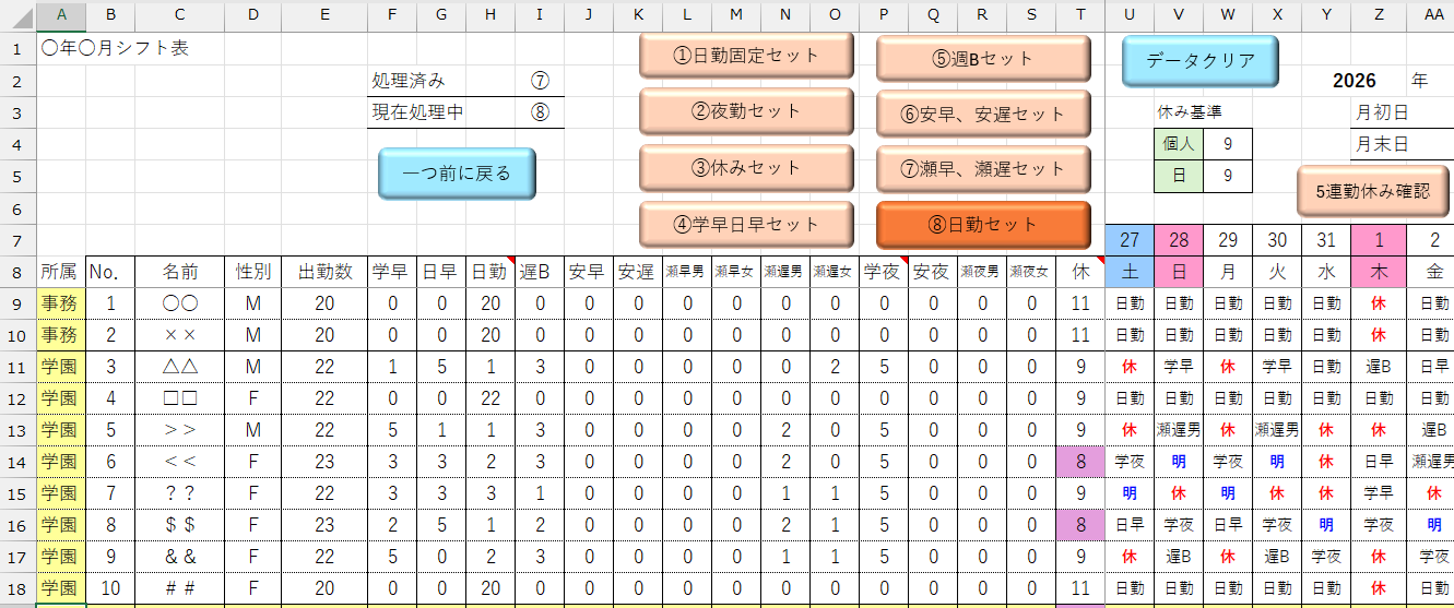 職員マスタを元に、①希望休み ②日勤土日祝休固定の職員のシフト設定 ③夜勤の設定 ④休みの設定 ⑤早番、遅番設定という順番でシフトを埋めていくものです。