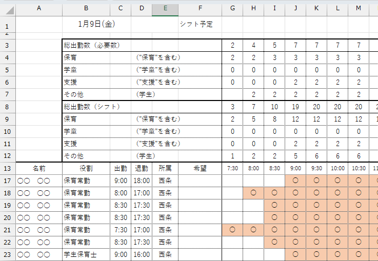 時間ごとに配置基準をクリアしている必要がある、要支援児童がいる場合は、特別に人を手配する必要がある、放課後児童クラブもやっている、等々、本当、シフト表の作成は大変ですね。