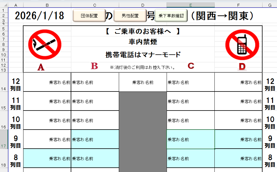 予約システムからダウンロードしてきたCSVデータから、座席表を作成するシステム(エクセルマクロ)です。