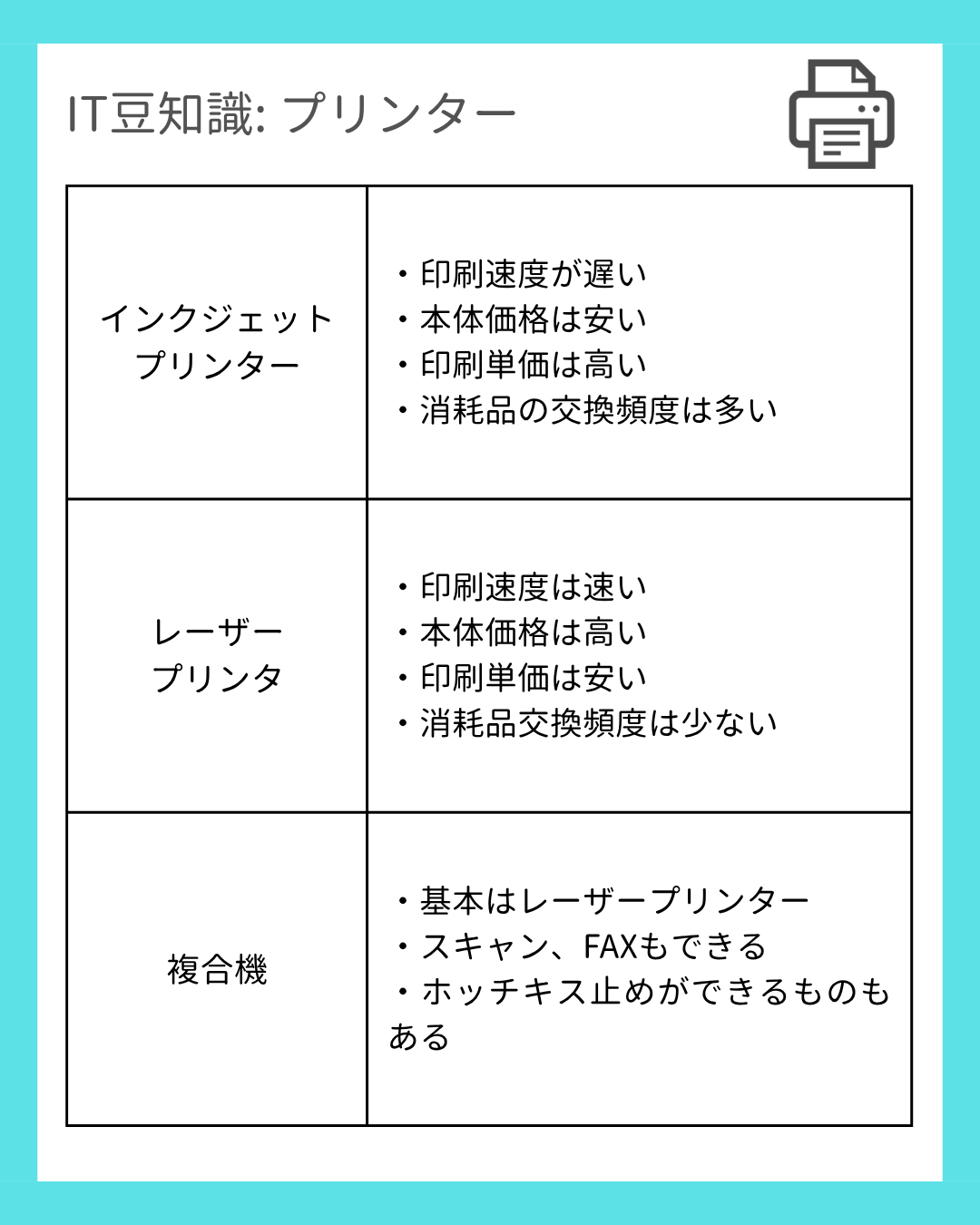 仕事で「伝票を印刷する」というように、印刷頻度が多い場合は、レーザープリンターを購入する必要があります。(モノクロのみ・カラー可、A3も印刷可、等の種類があります)