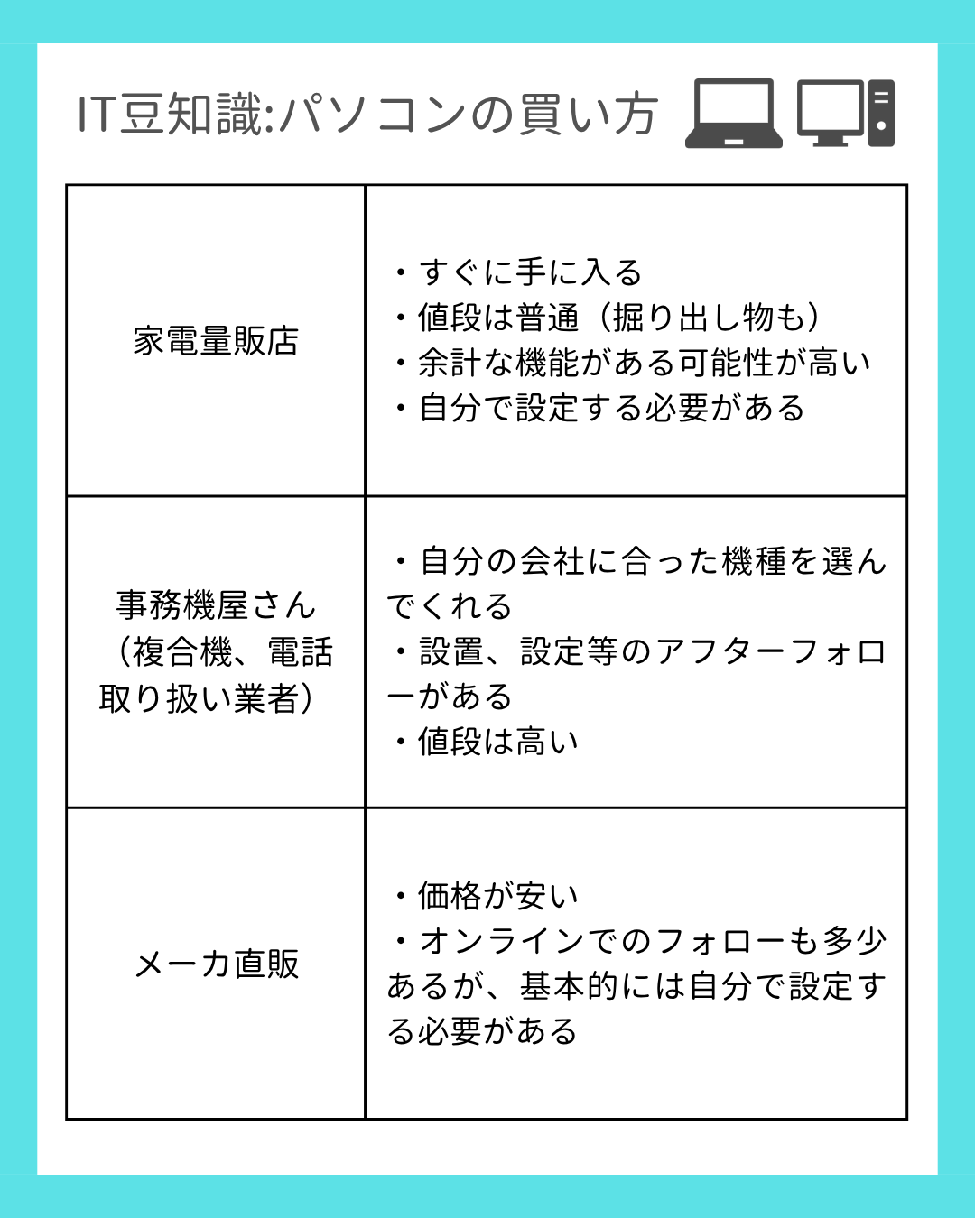 デメリットとしては、個人用のパソコンのため、ムダな機能(仕事には直結しない、動作が遅くなるだけの機能)がついている可能性があるので、注意しましょう。